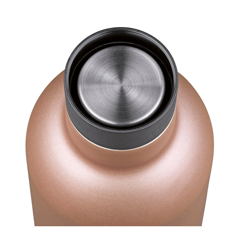 La bottiglia termica, realizzata in acciaio inossidabile, è caratterizzata dalla sua imboccatura a 360°, che consente di bere da qualsiasi punto del bordo della bottiglia. Dotata di un sistema a doppia parete con rivestimento interno in rame, che mantiene le vostre bevande calde fino a 18 ore e fredde fino a 24 ore. La bottiglia è adatta a bevande gasate, infrangibile ed è a tenuta stagna.