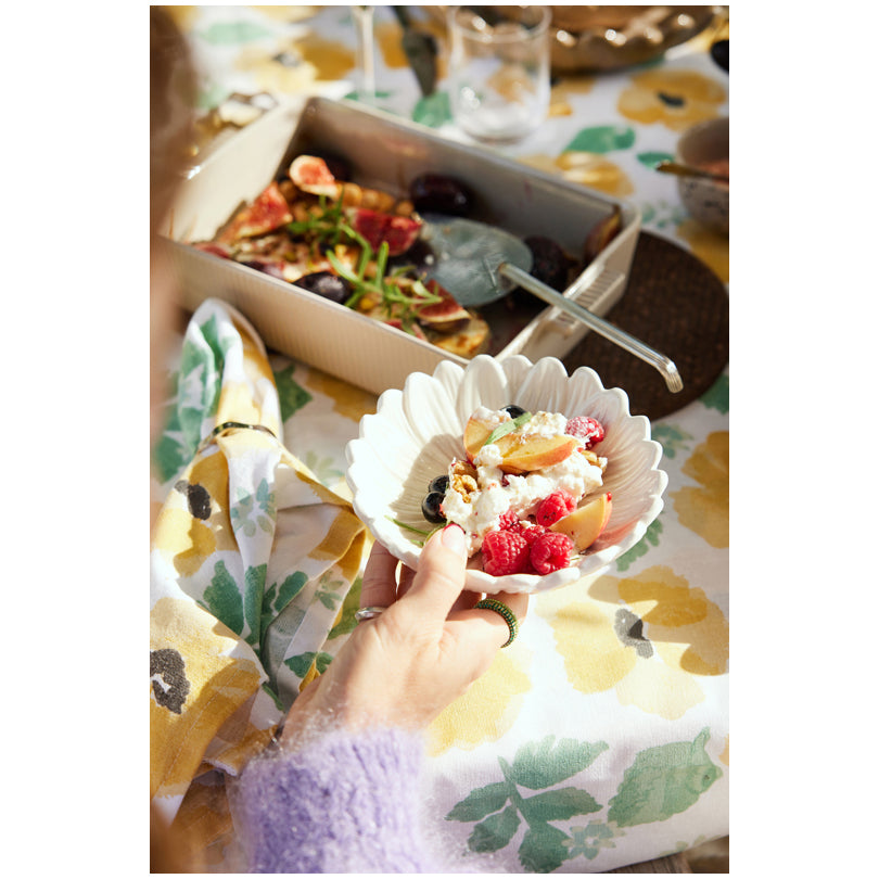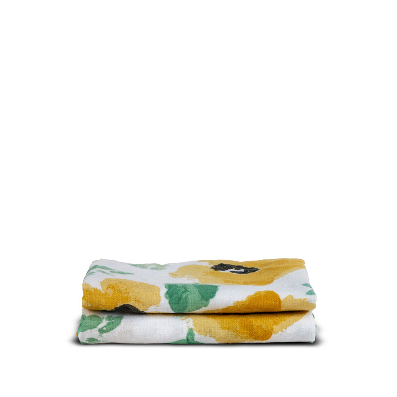 Lo strofinaccio a fantasia "Eden" è realizzato in sottile tessuto di cotone riciclato (70%) e poliestere (30%). Il motivo è progettato con cura con fiori dipinti in tenui pastelli gialli e beige. Uno strofinaccio, che sta benissimo sia in cucina che in bagno. Si asciuga rapidamente ed è facile da appendere. Lavabile a 40°C.