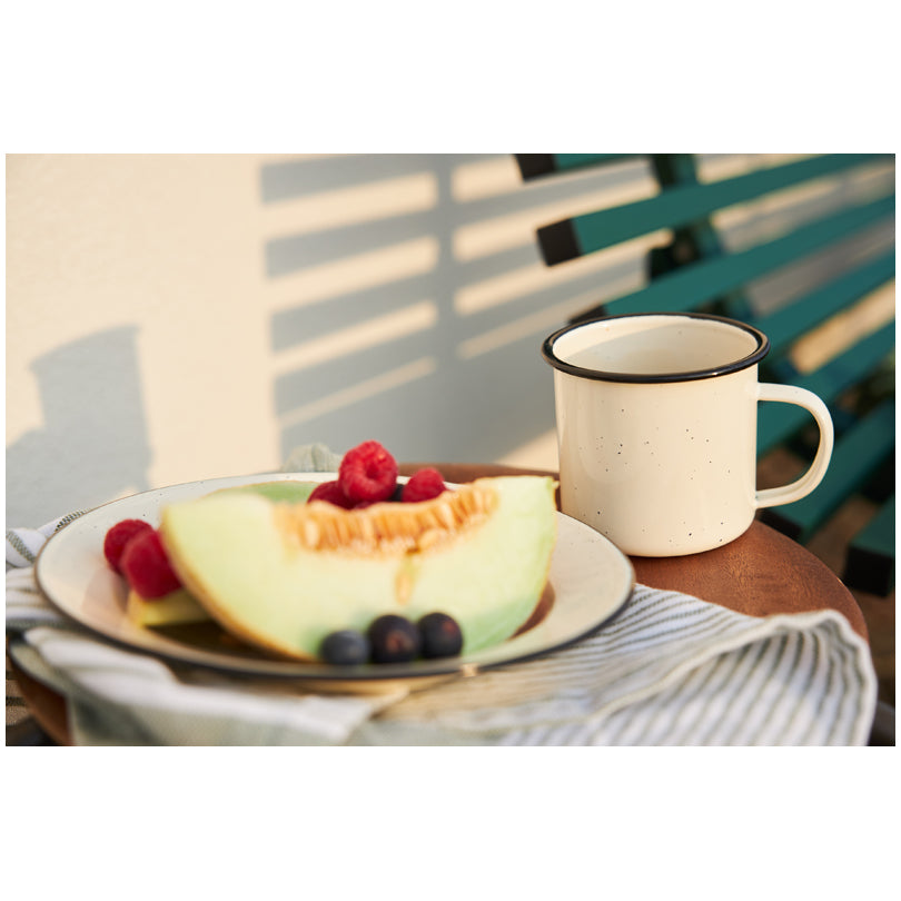 La linea "Doris", realizzata in acciaio smaltato, è composta da un piatto, una ciotola e una tazza. Offre tutto il necessario per un picnic o una gita in campagna. Gli articoli molto durevoli sono resistenti al calore e alle intemperie. La serie è disponibile in 3 colori, verde, beige e nero. Non adatto al lavaggio in lavastoviglie.