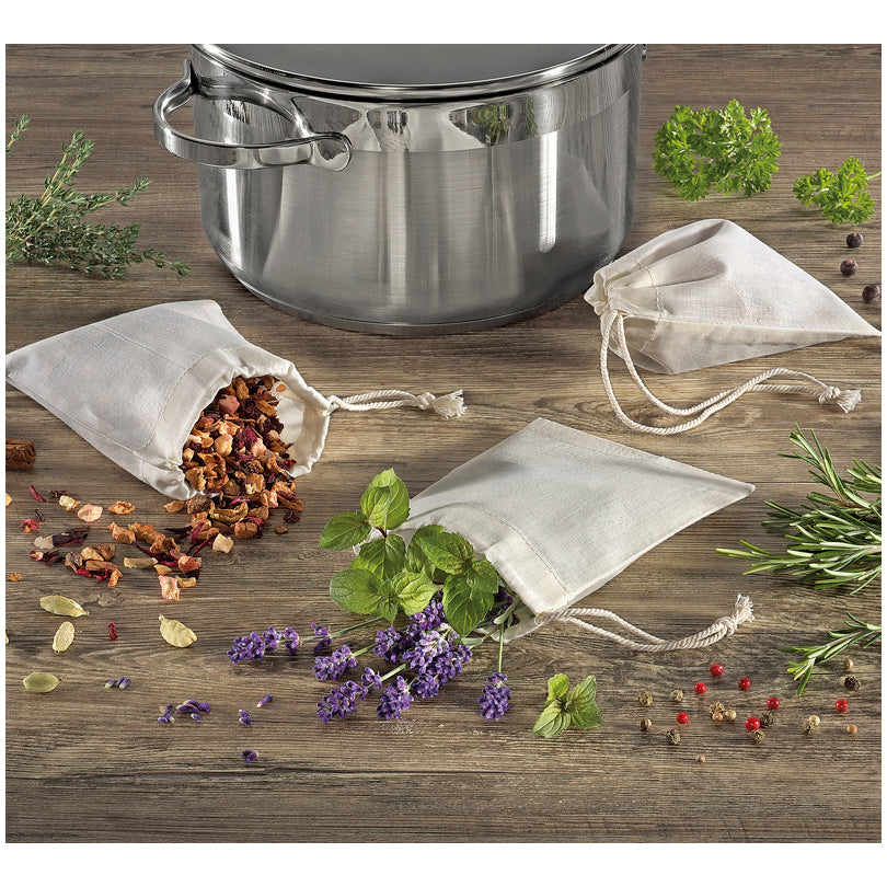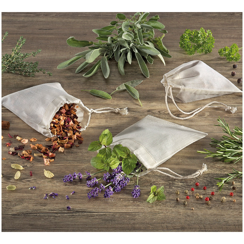 Le bustine per il tè riutilizzabili con chiusura a cordoncino sono realizzati in cotone grezzo 100%. Riempite con erbe e spezie donano ai vostri piatti un aroma intenso. Lavabili in lavatrice.