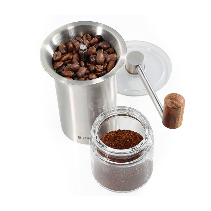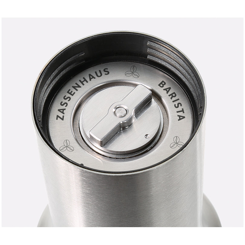 Il macinacaffè "Barista" è dotato di una macina di alta qualità, realizzata in acciaio inossidabile fresato a CNC. Il grado di macinatura desiderato può essere impostato con esattezza sul fondo della macina, da fine a grosso. Grazie all'apertura a forma di imbuto, il macinacaffè è facile da riempire. Il contenitore per i chicchi di caffè, realizzato in acciaio inox, ha una capacità di 40 g. Il contenitore di raccolta in vetro può essere utilizzato anche per facilitare il riempimento del contenitore per i chicchi di caffè. Spazzolina per la pulizia inclusa nella confezione.