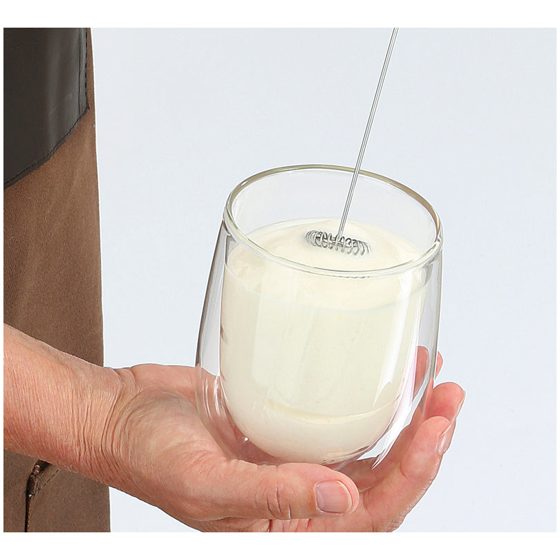 Lo schiumalatte con batteria ricaricabile agli ioni di litio (3,7V/500 mAh) crea una schiuma perfetta in modo rapido ed efficente. È adatto anche per la preparazione di vinaigrette e cocktail. Si avvia con la semplice pressione del pulsante, rendendolo facile da usare. Realizzato in resina di alta qualità. Cavo USB incluso nella fornitura.