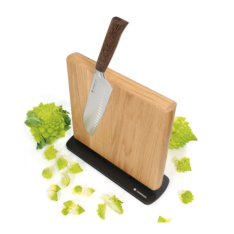 L'elegante ceppo coltelli magnetico dal design intramontabile è l'ideale per riporre in sicurezza i vostri coltelli. Il legno massiccio poggia su una stabile piastra in acciaio inossidabile verniciato nero. Su ogni lato del ceppo coltelli (utilizzabile su entrambi i lati) sono incorporate all'interno robuste bande magnetiche, che possono tenere fino a un massimo di 10 coltelli con una lunghezza della lama fino a 24 cm. Quindi avete sempre i vostri coltelli a portata di mano.
