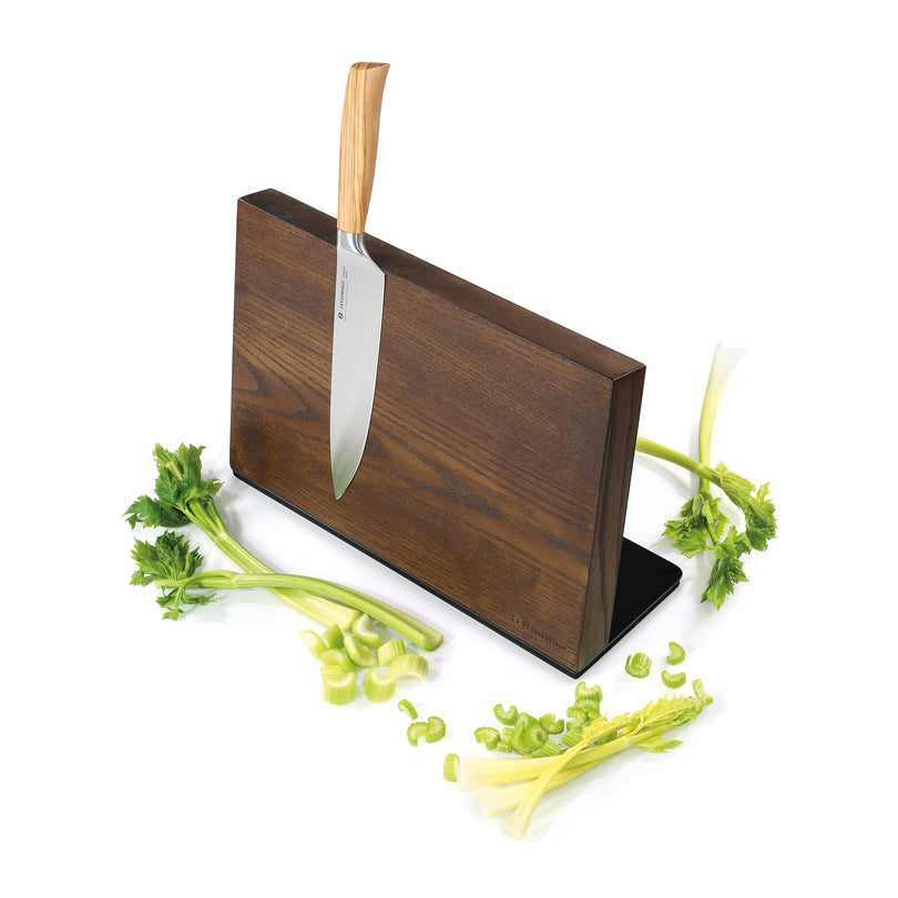 L'elegante ceppo coltelli magnetico dal design intramontabile è l'ideale per riporre in sicurezza i vostri coltelli. Il legno massiccio poggia su una stabile piastra in acciaio inossidabile verniciato nero. All'interno del ceppo sono incorporate delle robuste bande magnetiche, che possono tenere fino a un massimo di 8 coltelli con una lunghezza della lama fino a 23 cm. Quindi avete sempre i vostri coltelli a portata di mano.