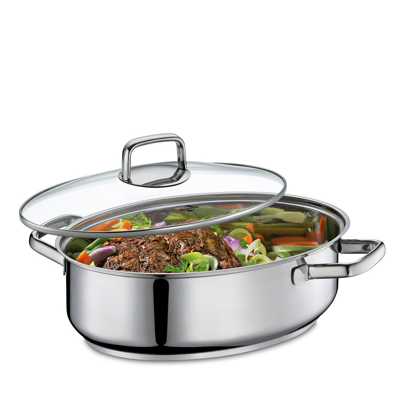 La casseruola Pisa, realizzata in acciaio inox, offre ampio spazio per arrosti delle feste e altri piatti deliziosi. È ideale per arrostire, brasare, gratinare e, grazie alla griglia, anche per la cottua a vapore. Il fondo multistrato extra-resistente garantisce una conduzione ottimale del calore, consentendo a carne, pesce, verdure e altri piatti di cuocere in modo uniforme. La casseruola è adatta al forno fino a 250°C, mentre il coperchio in vetro è adatto fino a 220°C. Adatta a tutti i piani di cottura, induzione inclusa.