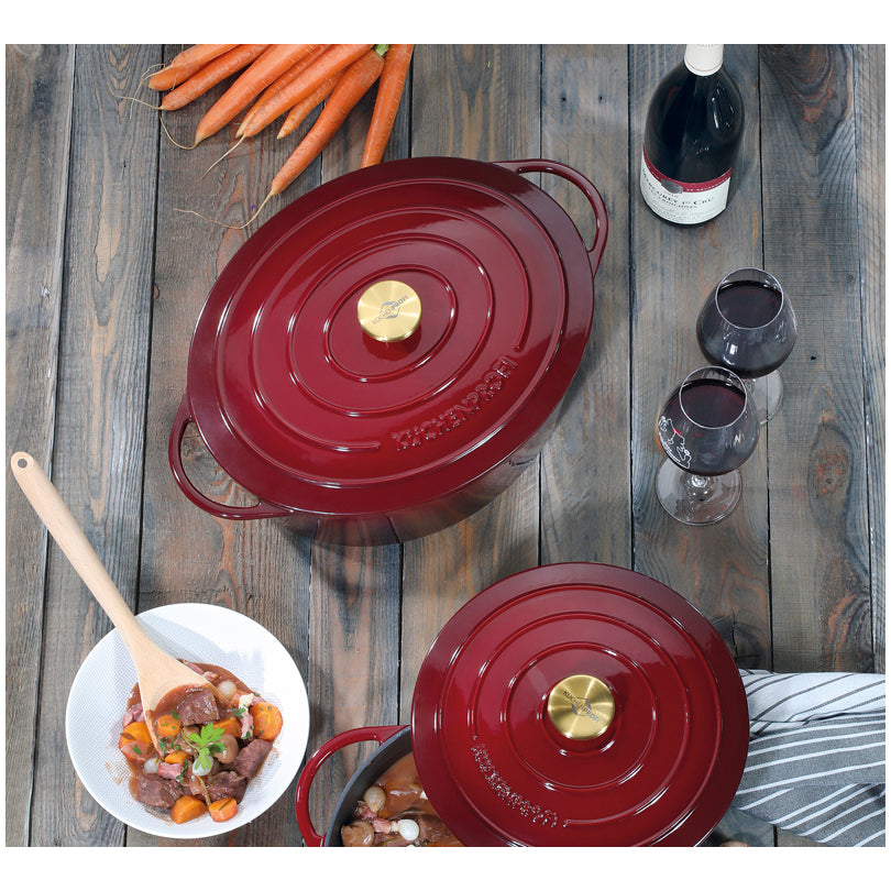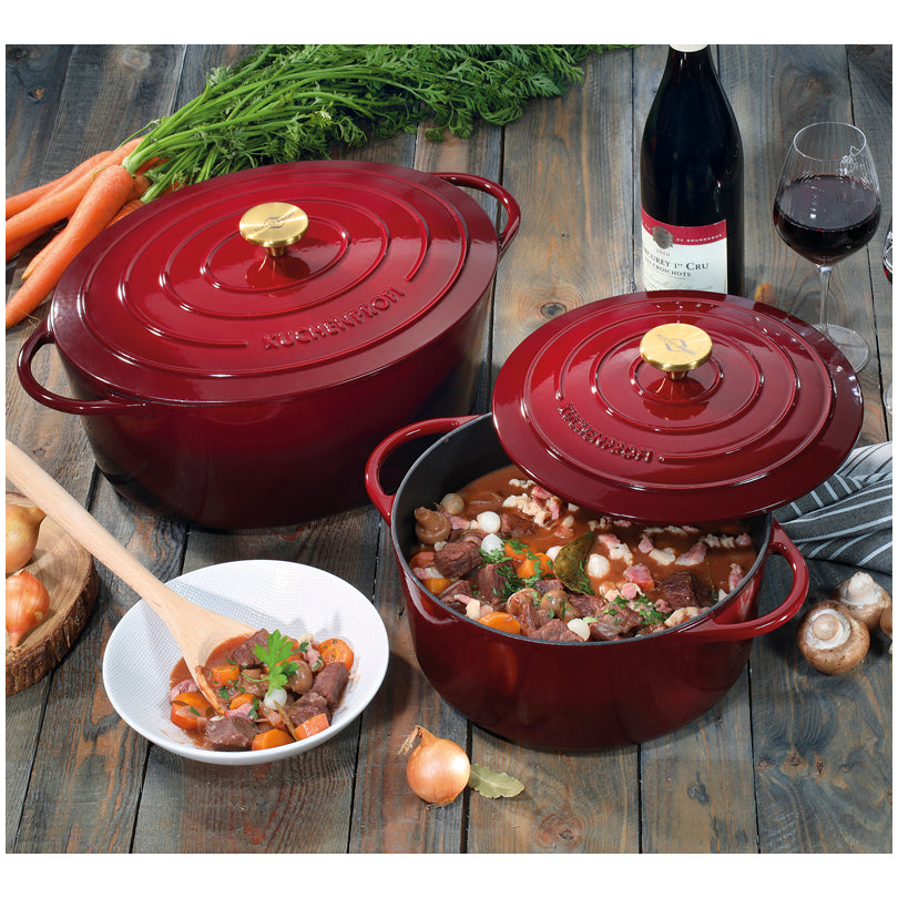 Le pentole in ghisa di ferro con un rivestimento di smalto durevole di alta qualità "Provence" sono versatili - utilizzabili per rosolare, brasare, cuocere al forno e friggere. Il loro materiale è caratterizzato da un'ottima capacità di accumulo termico e distribuzione del calore, che consente un notevole risparmio energetico. Facili da maneggiare e pulire. Il pomolo del coperchio in acciaio inossidabile è resistente al forno fino 250°C. Adatte a tutti i piani di cottura, induzione inclusa.