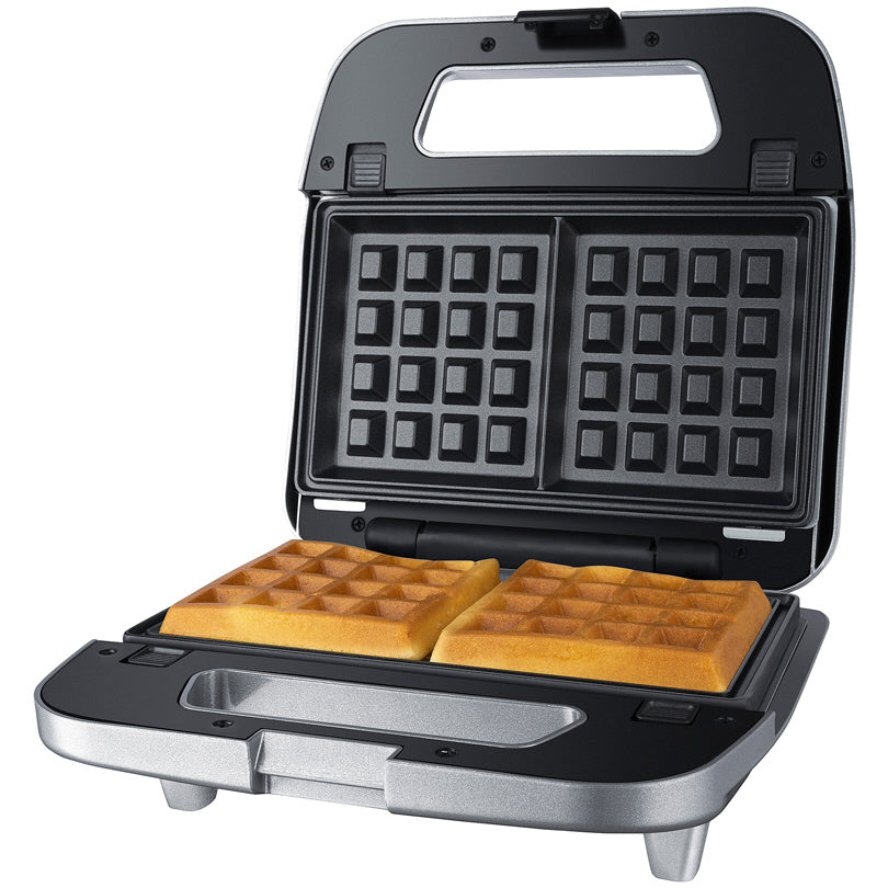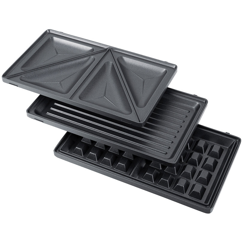 L'apparecchio è caratterizzato da 3 set di piastre diverse, con cui si può grigliare, tostare e preparare waffle gustosi. Grazie al sistema Easy-Click-Off, premendo il pulsante laterale, le piastre si lasciano togliere e cambiare in modo semplice. Inoltre è dotato di un'impugnatura a contatto freddo con morsetto di chiusura, spie luminose di funzionamento e temperatura e piedini in gomma antiscivolo per un posizionamento più sicuro. Facile da pulire. Dati tecnici: 220-240V~ - 50 Hz - 750 Watt - 2,6 kg