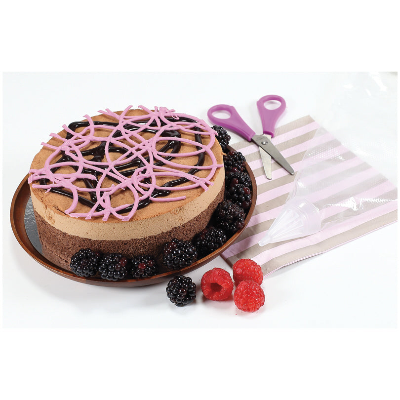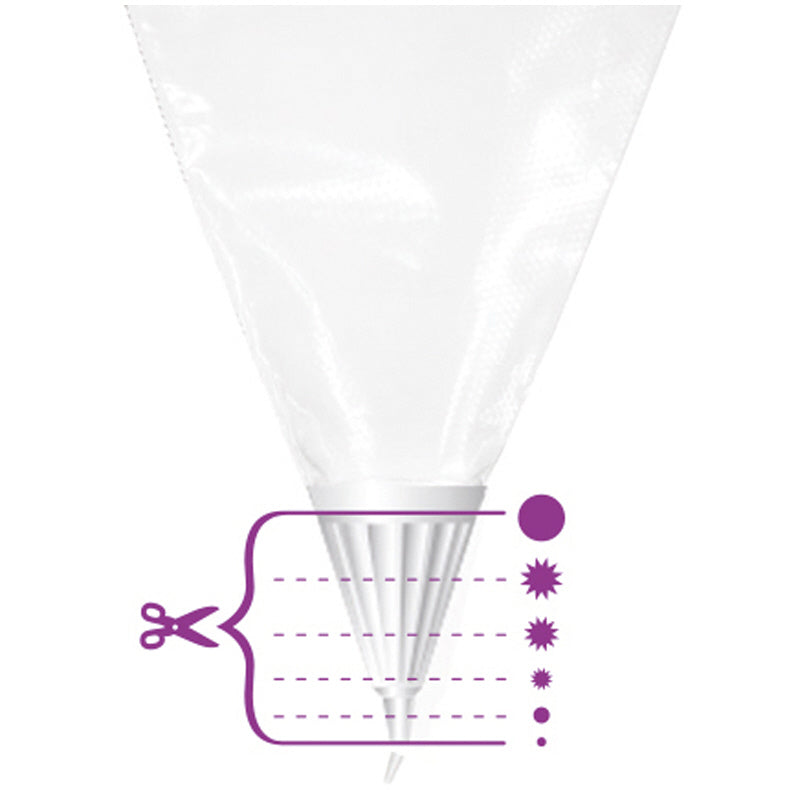 La punta del saccapoche è chiusa e può essere tagliata in forma, secondo grandezza e tipo di decorazione desiderata.