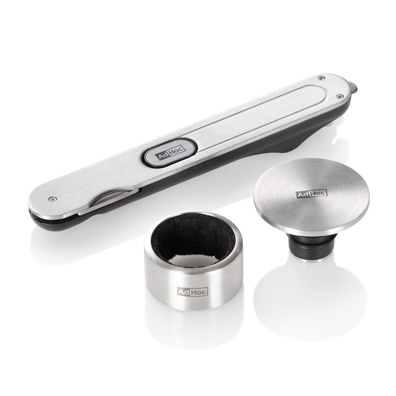 Il set da vino "Champ" è composto da: 1 cavatappi PushPull (KU50), 1 tappo da bottiglia Champ (FV41) e 1 anello salvagoccia Champ (FV45). Realizzato in acciaio inossidabile, resina e silicone.