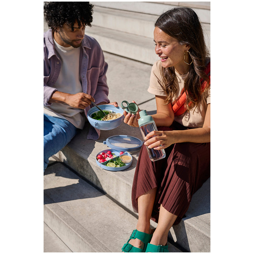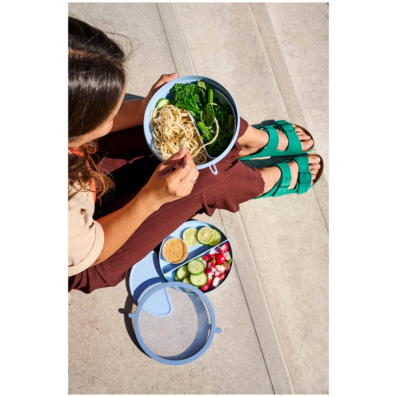 Una insalata estiva fresca e sfiziosa, un delizioso piatto di pasta, gli avanzi di ieri - portate semplicemente con voi il vostro pranzo nella vostra Vita Bento Bowl. Questa Bento bowl è dotata di 5 scomparti, così potete tenere separati le vostre diverse pietanze. Potete chiuderla facilmente con una rotazione e non vi dovrete più preoccupare, che a causa di eventuali fuoriuscite si bagni la borsa; la bowl è al 100% a tenuta stagna. Volete mangiare un piatto caldo? Nessun problema, la Bento bowl, senza coperchio, è adatta al microonde. Prodotto in Olanda con materiali riciclabili al 100% (polipropilene e silicone). Lavabile in lavastoviglie.