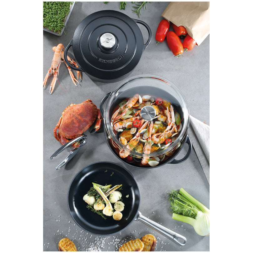 Le pentole in ghisa di ferro con un rivestimento di smalto durevole di alta qualità "Provence" sono versatili - utilizzabili per rosolare, brasare, cuocere al forno e friggere. Il loro materiale è caratterizzato da un'ottima capacità di accumulo termico e distribuzione del calore, che consente un notevole risparmio energetico. Facili da maneggiare e pulire. Il pomolo del coperchio in acciaio inossidabile è resistente al forno fino 250°C. Adatte a tutti i tipi di piani di cottura, induzione inclusa. Peso: 5,50 kg