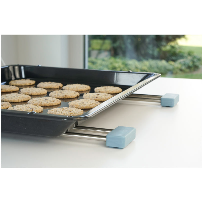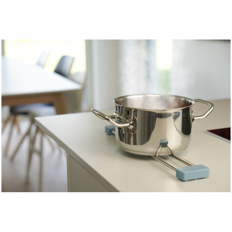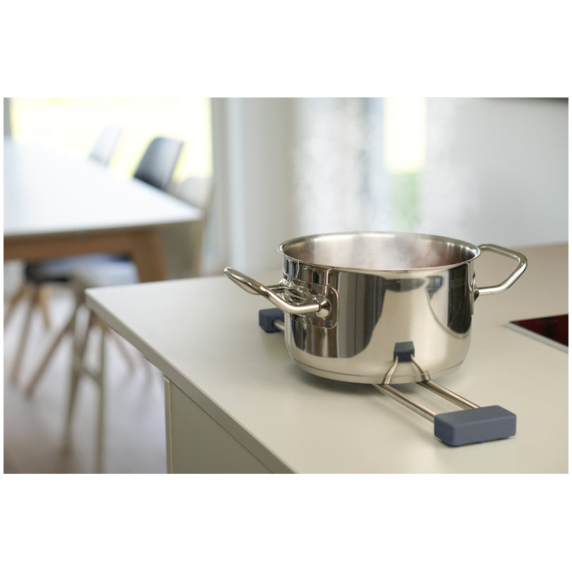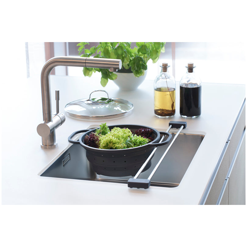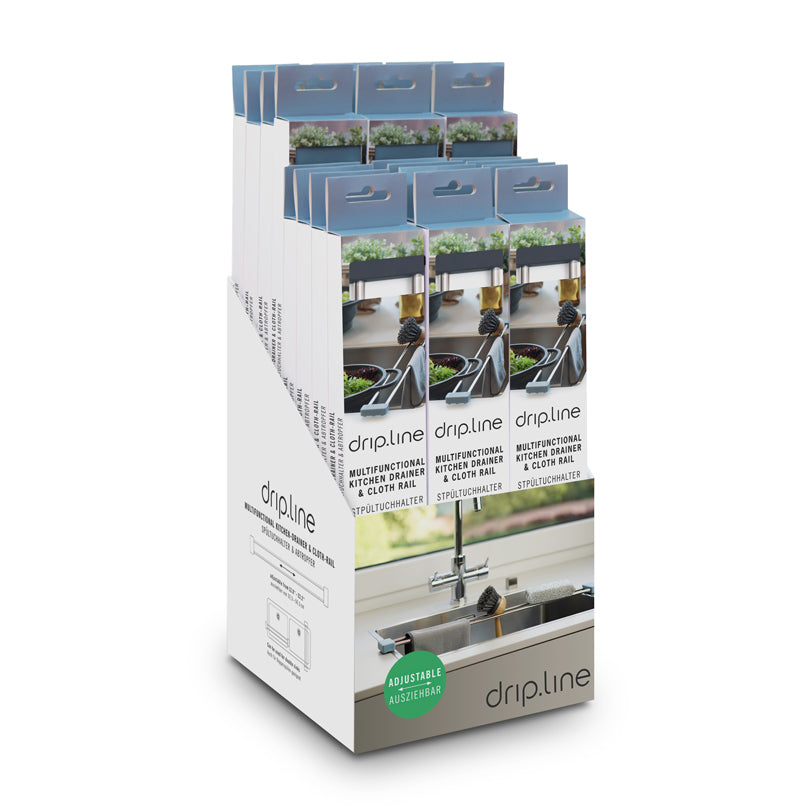 La sbarra multifunzionale e regolabile drip.line offre delle soluzioni intelligenti in cucina. Può essere usato come: portapanno-/spugna, appoggio coperchio, griglia raffreddateglie/-torte e supporto scolapasta. L'attrezzo, resistente al calore fino a 220°C, è realizzato in acciaio inox e silicone (privo di BPA). Lavabile in lavastoviglie ed utilizzabile anche per un lavandino doppio.