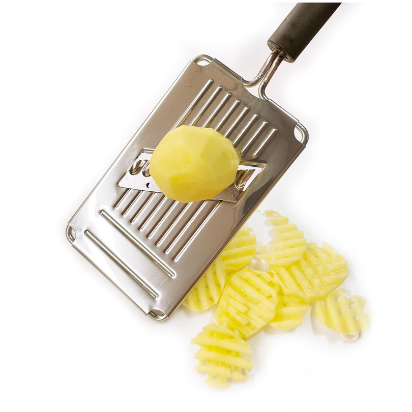 L'affettaverdura con taglio ondulato dona alla fette di verdure/frutta tagliata un tocco decorativo. Ruotando la verdura/frutta di 90° durante il taglio, si ottengono fette sottili con una struttura a griglia o cialda. Realizzato in acciaio inossidabile e resina di alta qualità. Lavabile in lavastoviglie.