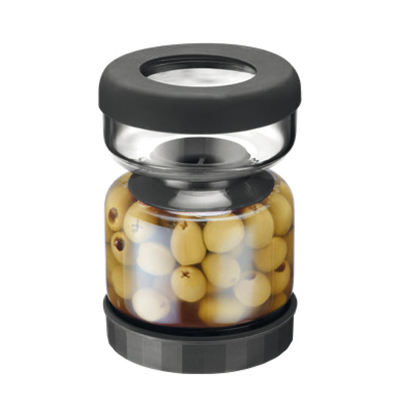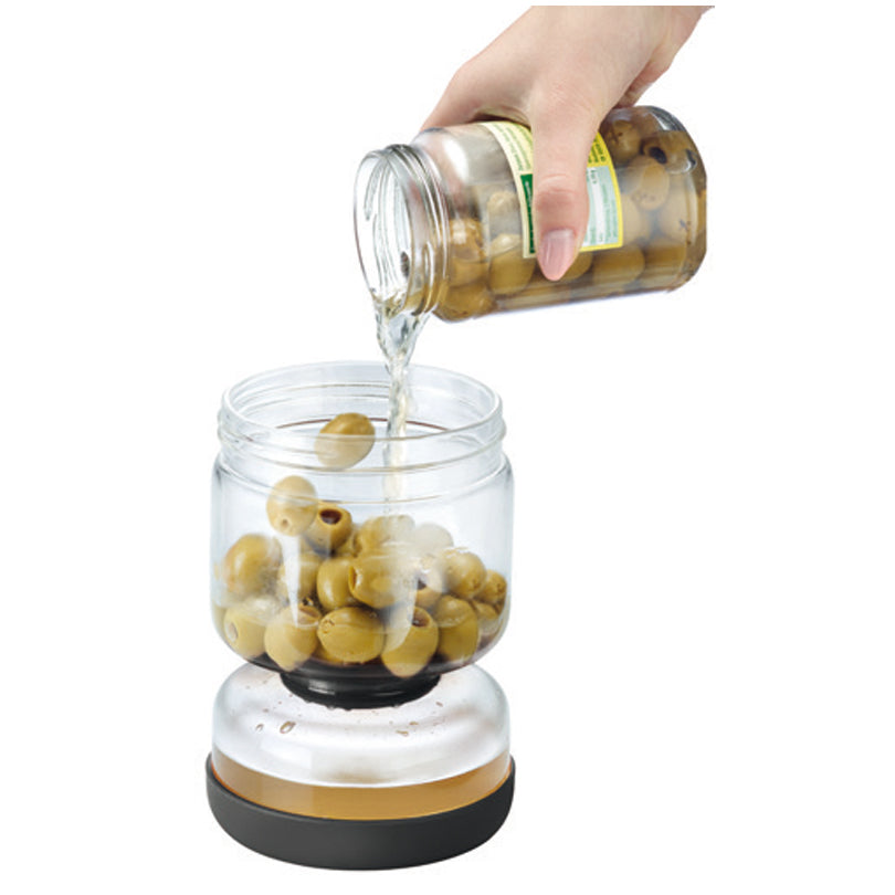 Il barattolo sgoccialamento a tenuta stagna dotato di un setaccio, grazie al suo sistema di 2 scomparti, è ideale per servire e conservare. Ecco come funziona: prima di servire verdure sottaceto/antipasti sottolio, versate semplicemente il contenuto nello scomparto più grande del barattolo. Il liquido scorre nello scomparto più piccolo per la successiva conservazione. Nel caso che non viene consumato tutto il contenuto, chiudete semplicemente lo scomparto grande con il coperchio e ruotatelo di 180°. Il liquido precedentemente separato scorre indietro nello scomparto grande. Ora potete conservare i vostri stuzzichini preferiti in frigorifero. L'aiutante da cucina può essere smontato per una pulizia accurata. Lavabile in lavastoviglie e privo di BPA.