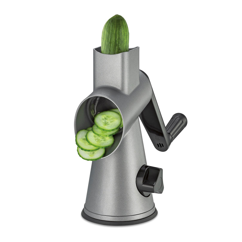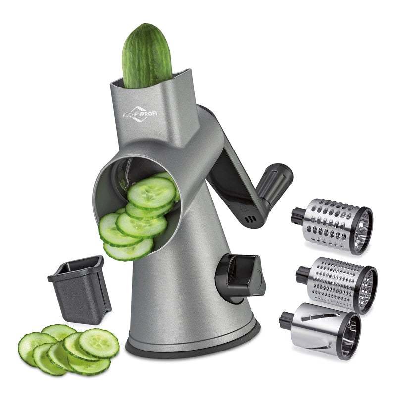 Listarelle e fette uniforme, grattugiare fino e grosso. tutto è possibile con l'affettaverdure Vario. Dotato di un fermaverdure, un contenitore di raccolta...