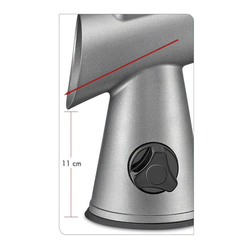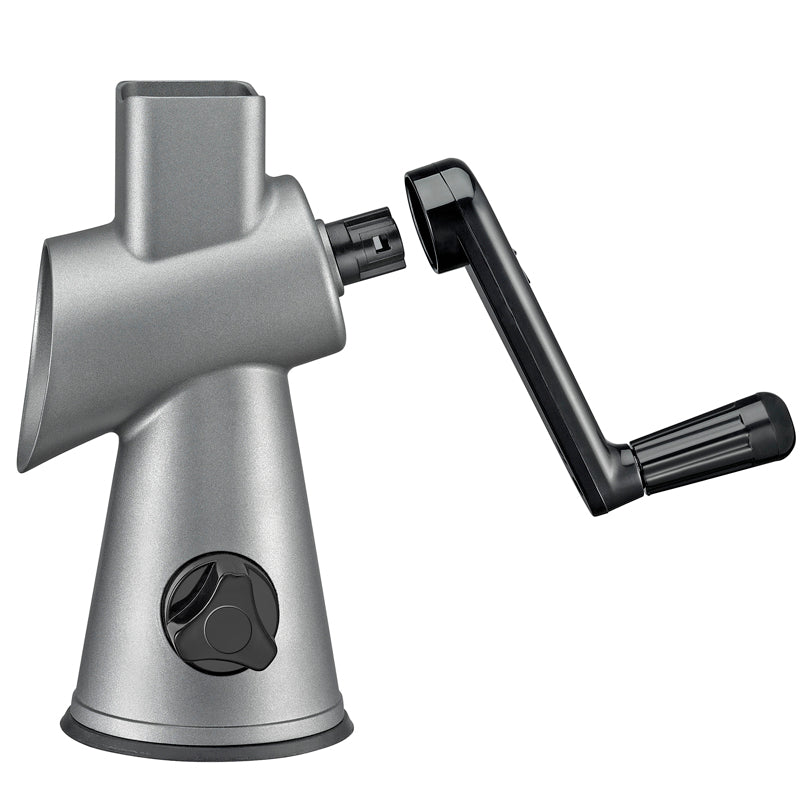 La grattugia a tamburo "Robusto" è l'aiutante universale per grattugiare (grosso e fine) o tagliare a fette in ogni cucina. La grattugia multifunzionale a manovella è perfetta per elaborare frutta, verdura, formaggio, cioccolata, noci e tanti altri ingredienti in un batter d'occhio. Il pestello in dotazione garantisce sicurezza durante l'uso. Grazie alla base extra alta, anche le ciotole più alte trovono spazio sotto la grattugia (fino ad un'altezza di 11 cm ). La ventosa sul retro permette un arresto sicuro. Con il morsetto incluso, la grattugia può essere fissata a piani di lavoro con uno spessore fino a 4,5 cm. Il corpo della grattugia è realizzato in allumino pressofuso rivestito, i tamburi grattugianti in acciaio inossidabile.