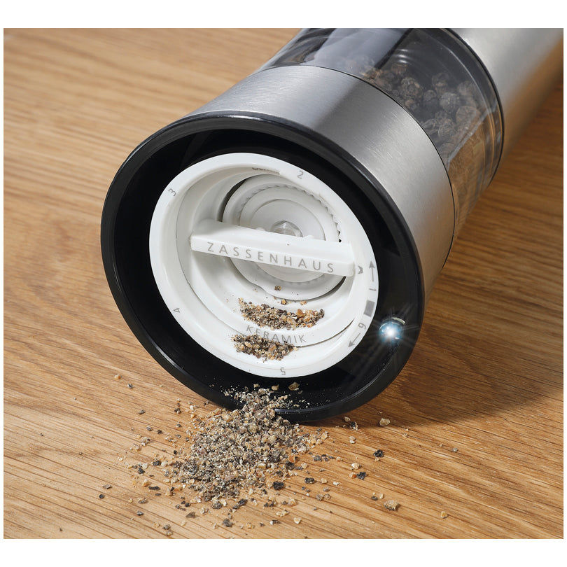 Il macinapepe elettrico Gera è dotato di un accumulatore litio-polimero (3,7 V - 500 mAh) integrato, macina in ceramica di alta qualità con regolazione continua del grado di macinatura. Il grado di macinatura può essere regolato con precisione, da fine a grosso. La luce LED integrata garantisce un'illuminazione ottimale durante l'uso. Adatto anche per sale ed erbe aromatiche essiccate. Cavo per la ricarica della macina incluso nella confezione.