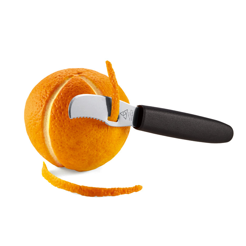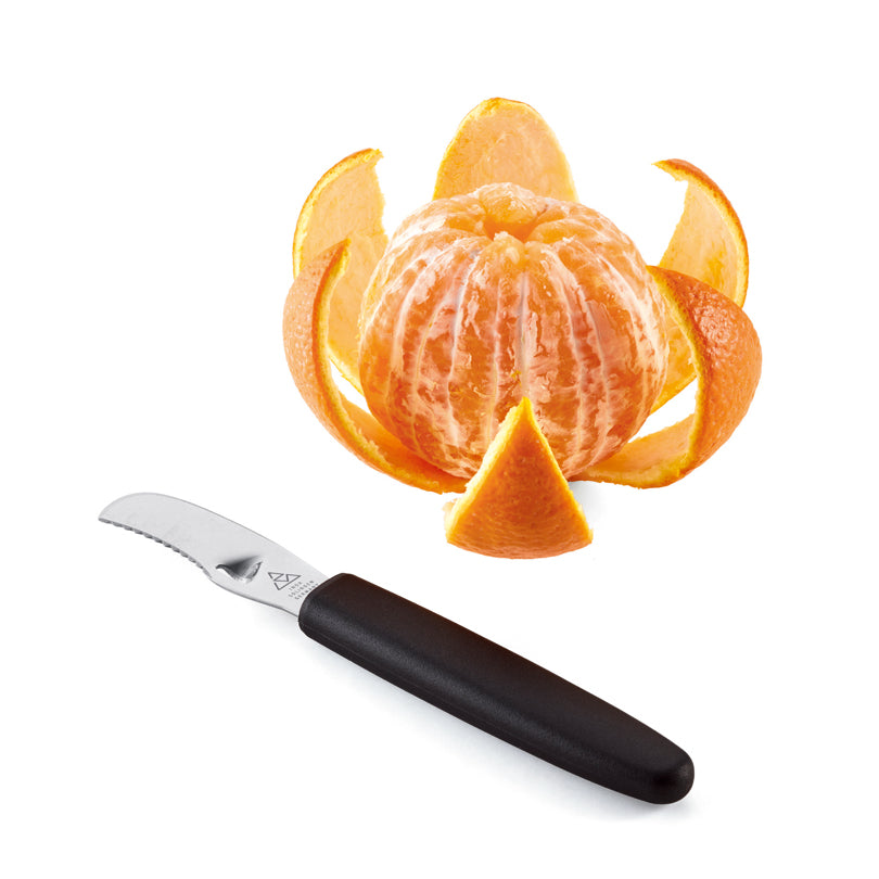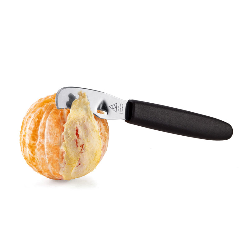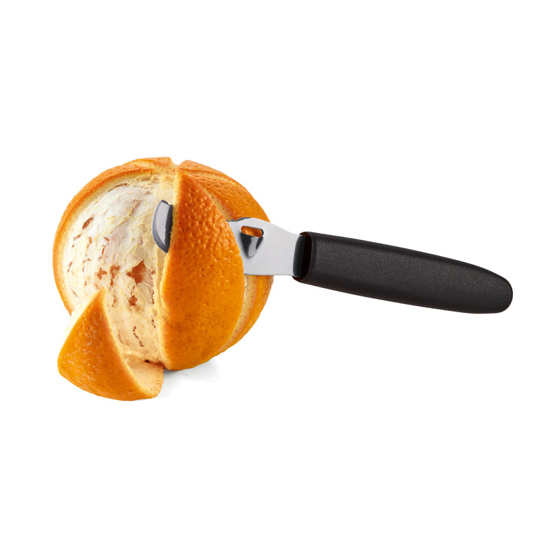 Lo sbuccia arance aiuta a sbucciare e dividere arance e pompelmi. Come funziona: intagliare la buccia con la tacca. In seguito, utilizzando il lato seghettato, sollevare la buccia ed eliminare la buccia bianca amara. Il lato liscio dell'attrezzo aiuta ad ottenere gli spicchi d'arancia, senza sporcarsi le dita. Oltre ad intagliare la buccia d'arancia, la tacca può essere utilizzata anche come coltello per cesellare. Lama realizzata in acciaio inox , manico in poliamide. Lavabile in lavastoviglie.
