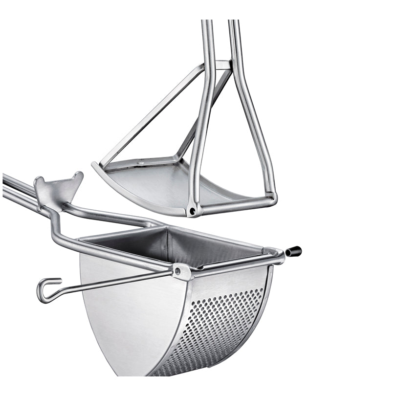 Lo schiacciapatate, realizzato in acciaio inossidabile, è da molti decenni un indispensabile aiutante in cucina. Basta rimuovere il perno di bloccaggio per una facile pulizia.