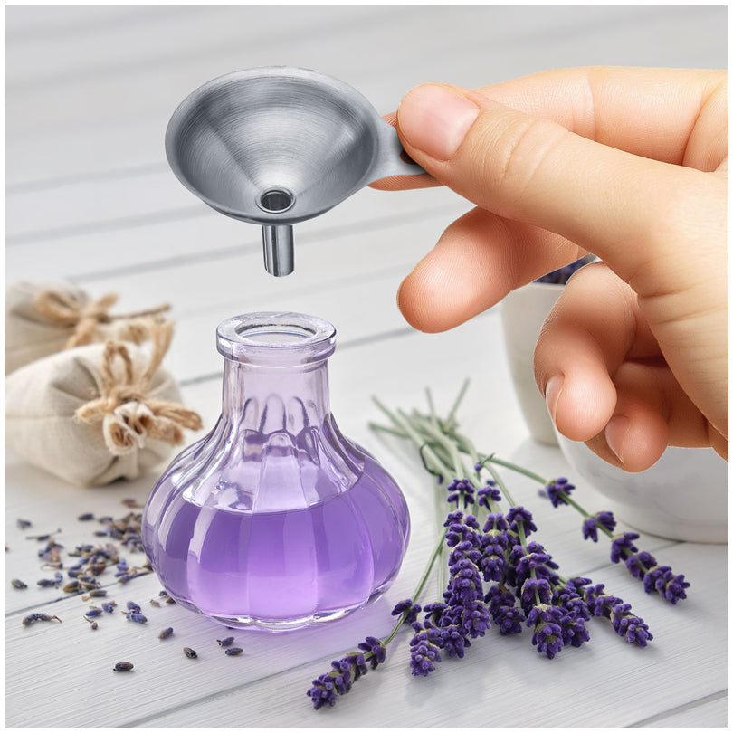 Con i tre imbuti, riempire e travasare liquidi in piccoli contenitori come flaconi per cosmetici e barattoli con piccola apertura di riempimento diventa un gioco da bambini. Dopo l'uso, possono essere facilmente lavati in lavastoviglie e riposti insieme all'anello in dotazione.