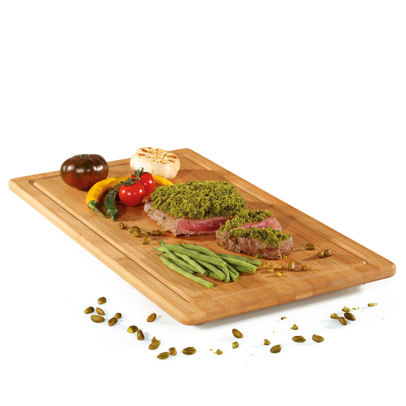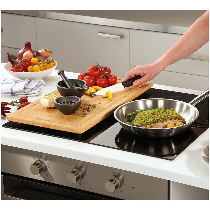 La spianatoia, realizzata in bambù sostenibile, crea ulteriore spazio in cucina, ma può anche essere utilizzata come semplice tagliere o tagliere da portata. Inoltre, utilizzabile anche per coprire il vostro piano cottura in vetroceramica. I piedini antiscivolo sul lato inferiore garantiscono un arresto sicuro. Cura: pulire il tagliere solo con un panno umido e lasciarlo asciugare in posizione verticale. Eccessiva umidità o differenze di temperatura possono provocare deformazioni, crepe e scolorimento.
