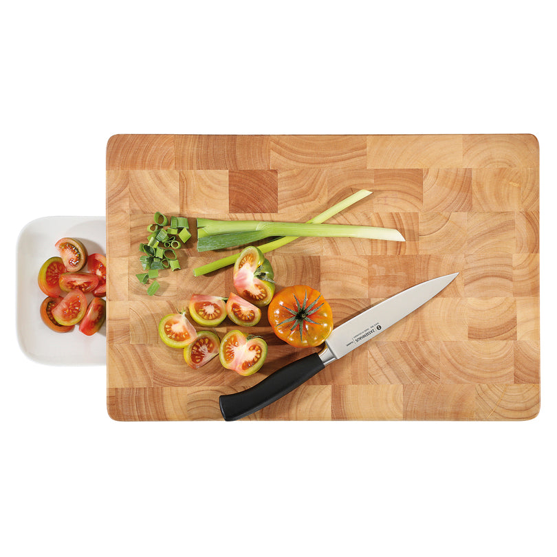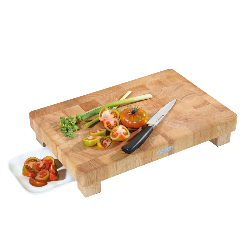 Il tagliere con piedini extra alti, realizzato in legno dell'albero della gomma, proveniente da piantagioni sostenibili, è un vero colpo d'occhio. L'affascinante struttura a mosaico, realizzata con tasselli di legno singolarmente incollati, non è solo esteticamente gradevole, essa rende il tagliere particolarmente resistente e durevole. I piedini extra alti ed antiscivolo, permettono di posizionare sotto il tagliere dei piatti e vassoi piani. Dopo l'uso, basta pulirlo con un panno umido e lasciarlo asciugare in posizione verticale.