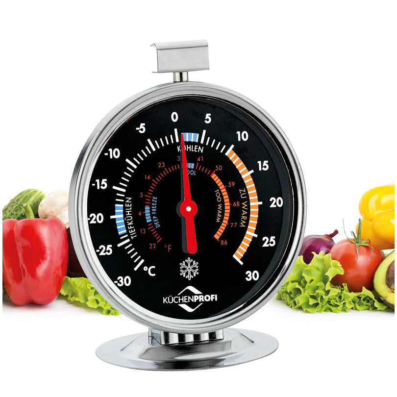 Il termometro analogico per freezer e frigo, realizzato in acciaio inossidabile, vi aiuta a conservare i vostri alimenti a temperatura ideale. Non è solo pronto per l'uso in frigorifero, ma anche nel congelatore - campo di misurazione da -30°C a +30°C. Suggerimento: posizionare l'aiutante di cucina al centro del frigorifero o congelatore in un punto ben visibile. Con una dimensione totale di circa 7,5 cm, il termometro non occupa molto spazio ed è di facile lettura per un rapido controllo della temperatura.