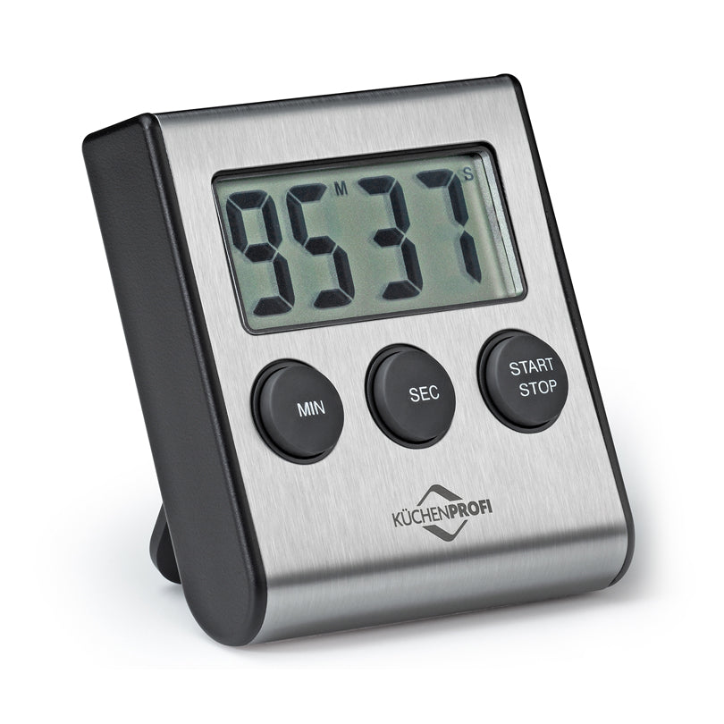 Il contaminuti digitale da cucina è dotato di una calamita, un supporto e un occhiello per appenderlo. Quadrante: 99 minuti e 59 secondi. 1 batteria (1,5 V AAA) inclusa nella confezione.
