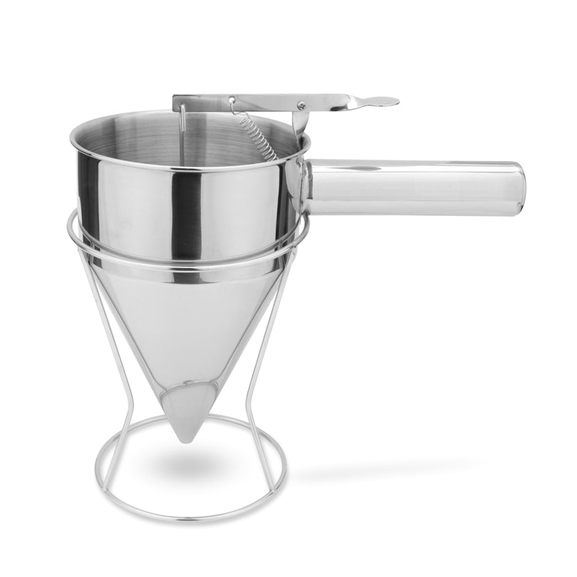 L'imbuto colatore, con la sua chiusura antigoccia al 100%, è ideale per porzionare in modo sicuro e rapido impasti, salse, cioccolato fuso, glassa e molto altro. Il pratico utilizzo con una sola mano e l'impugnatura ergonomica tubolare ne facilitano l'utilizzo. Il supporto incluso consente un appoggio igienico e sicuro.