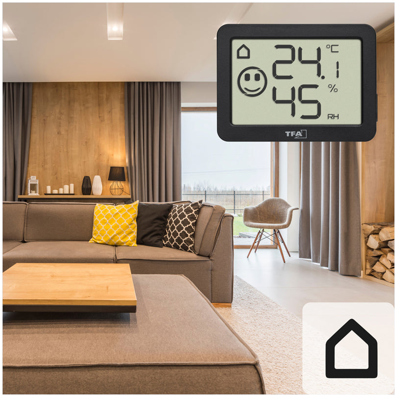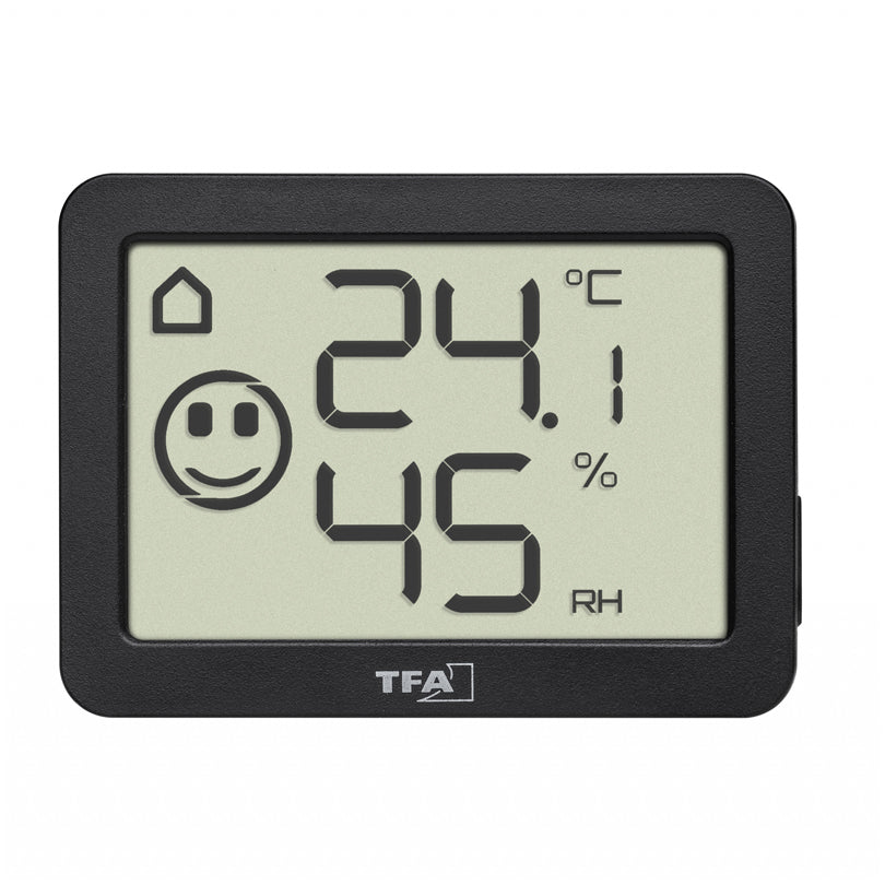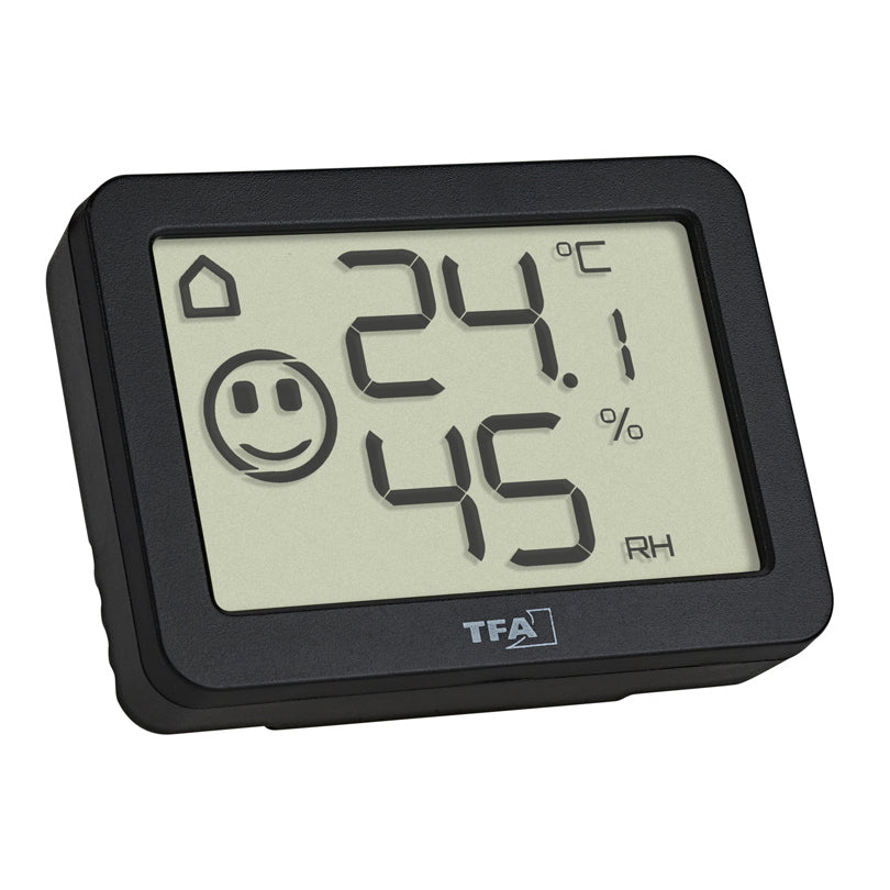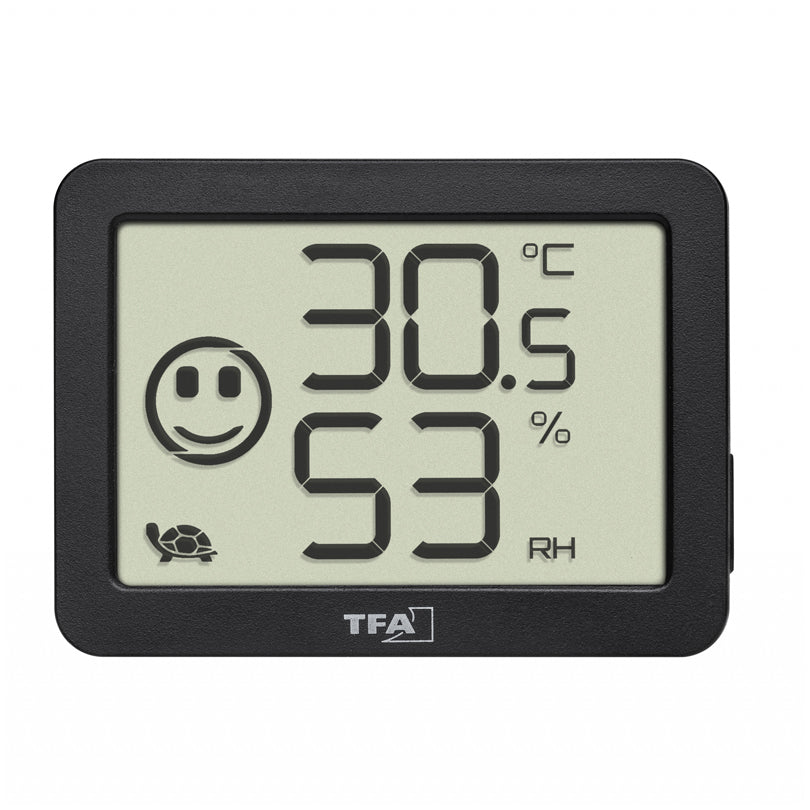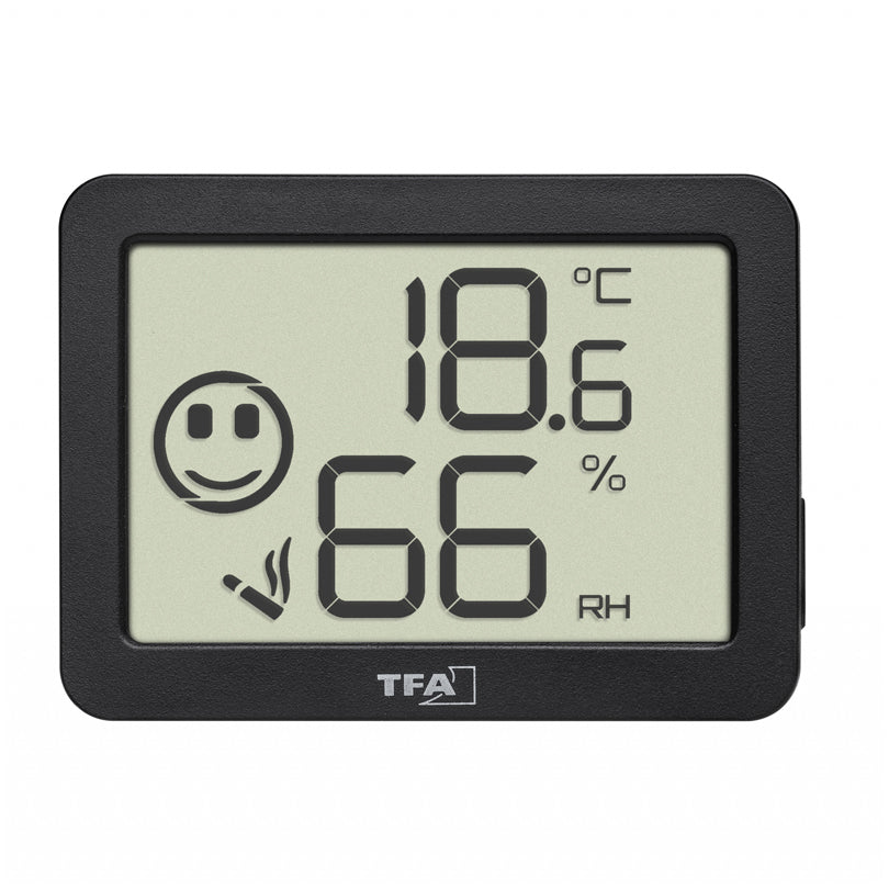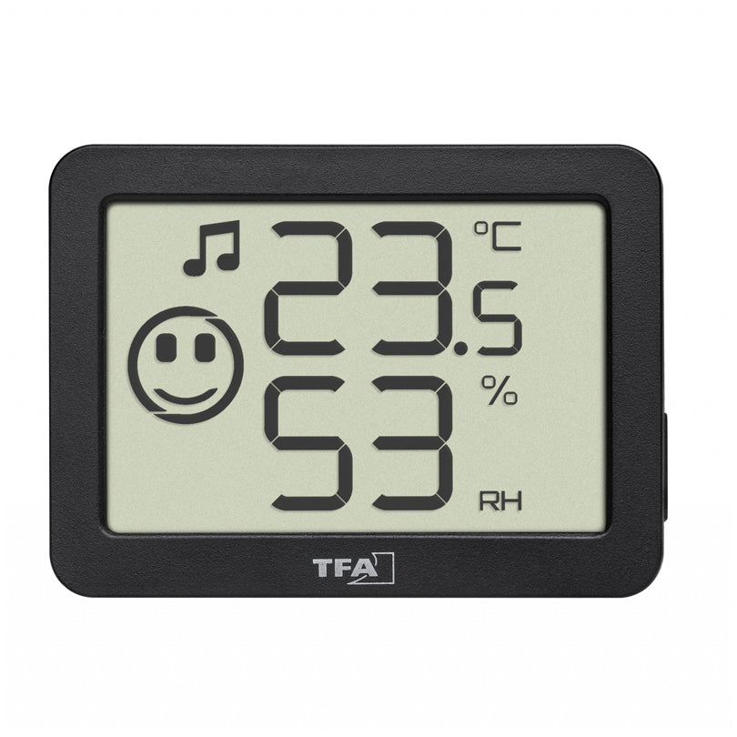 Con questo pratico e piccolo termoigrometro, potete facilmente tenere d'occhio la temperatura e l'umidità, e se necessario regolarle. I valori minimo e massimo vengono memorizzati e visualizzati premendo un pulsante. Il termoigrometro si attacca alle superfici metalliche, grazie alle 2 calamite sul retro, o puo restare in piedi, grazie al supporto pieghevole sul retro. L'indicatore del comfort climatico classifica il livello di comfort della temperatura e dell'umidità attualmente misurato: uno smiley sorridente mostra quando le condizioni climatiche sono ottimali. Uno smiley neutro o triste indica rispettivamente condizioni moderate o cattive. Le aree di applicazione sono varie: per ambiente, per terrari, per strumenti musicali, per armadietti per sigari (humidor). Batteria non inclusa (1x 1,5V AA)