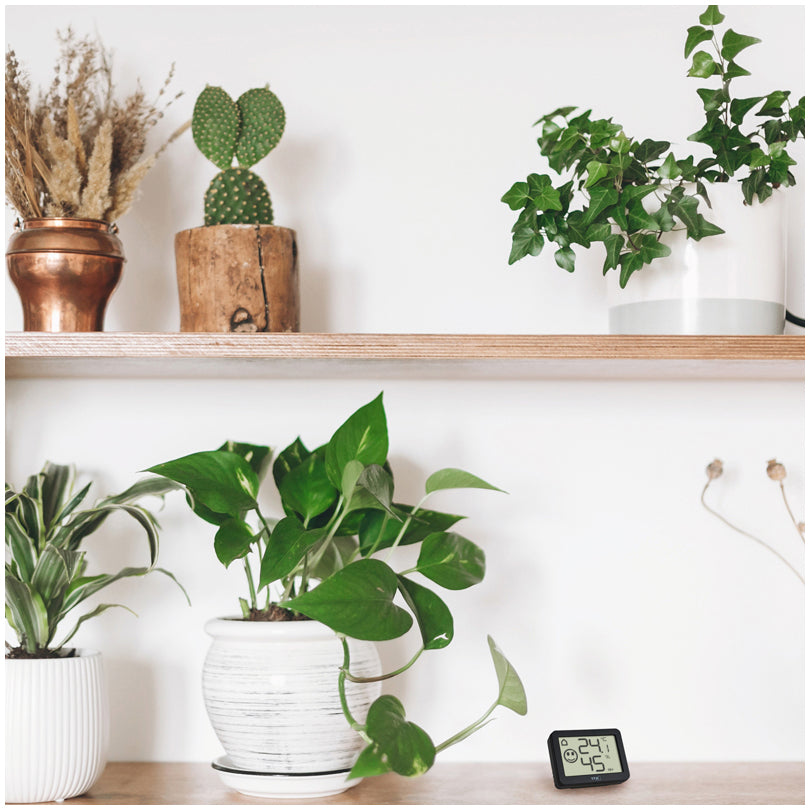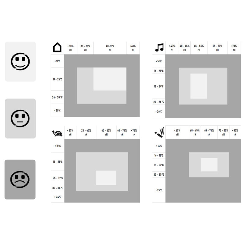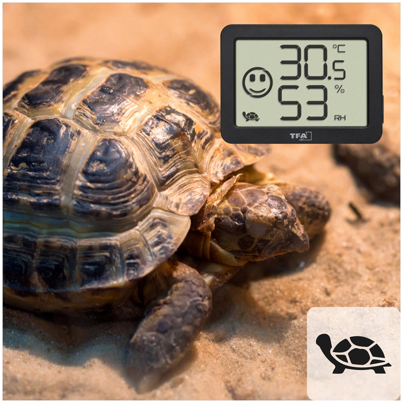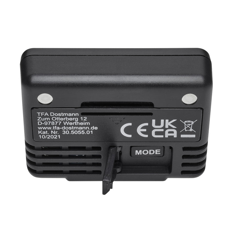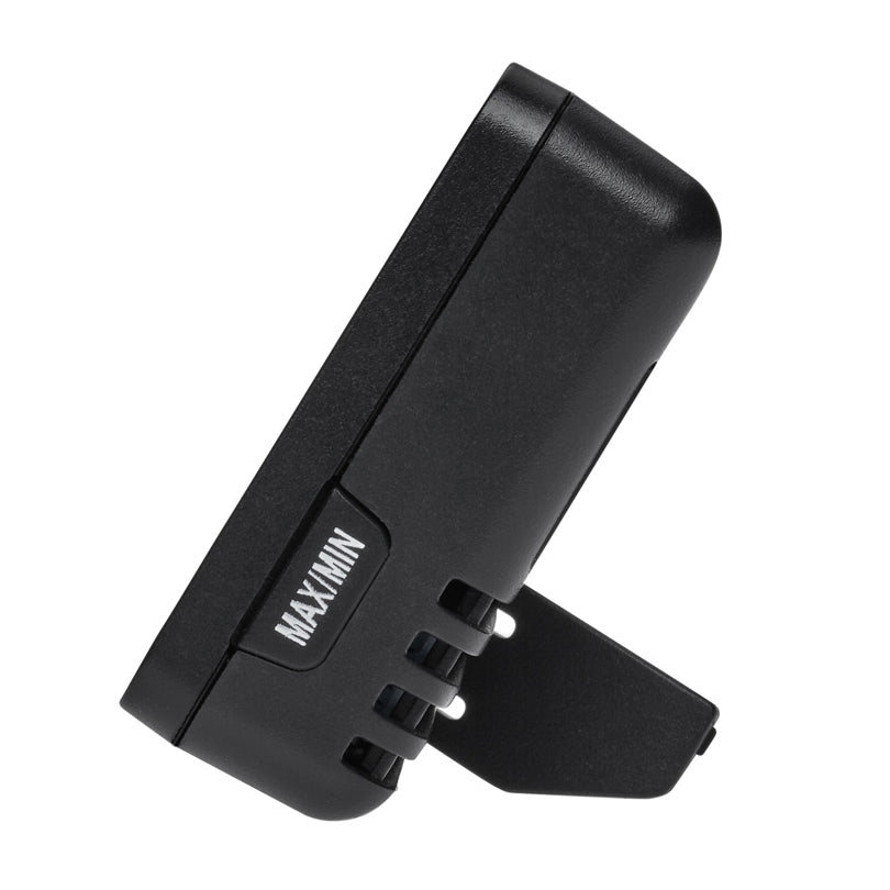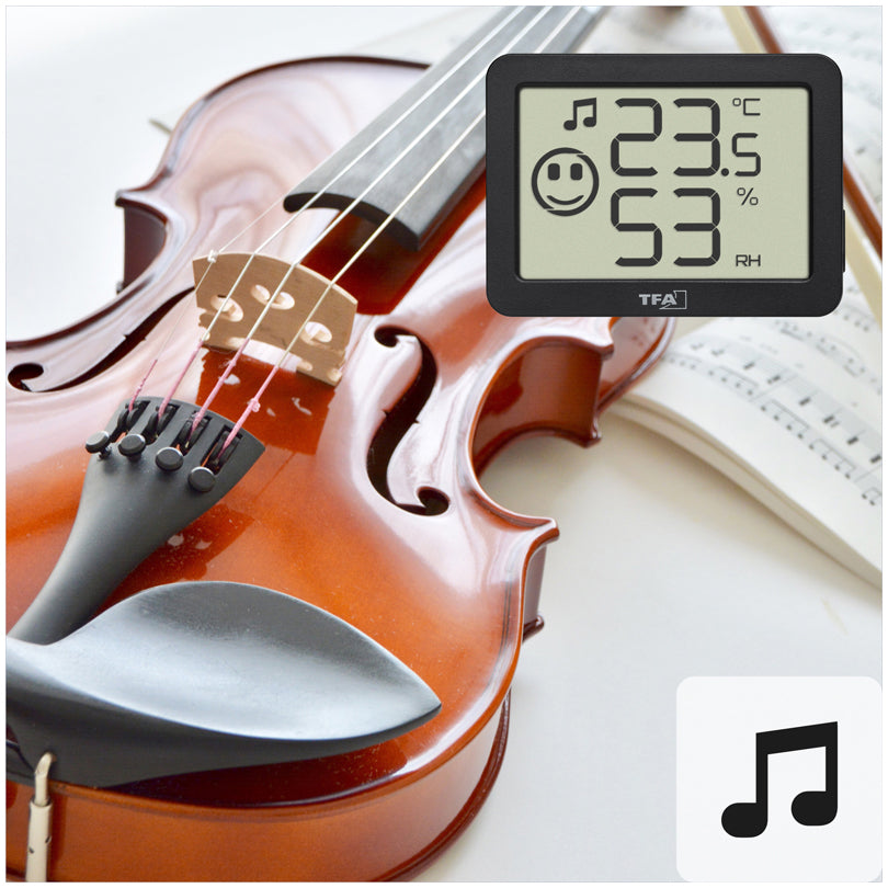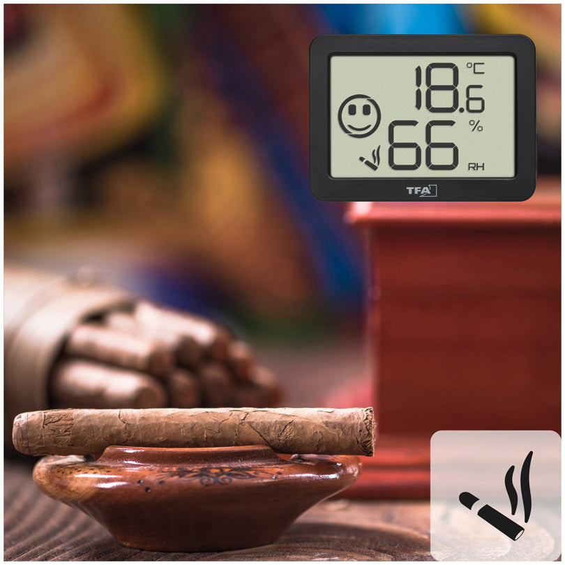 Con questo pratico e piccolo termoigrometro, potete facilmente tenere d'occhio la temperatura e l'umidità, e se necessario regolarle. I valori minimo e massimo vengono memorizzati e visualizzati premendo un pulsante. Il termoigrometro si attacca alle superfici metalliche, grazie alle 2 calamite sul retro, o puo restare in piedi, grazie al supporto pieghevole sul retro. L'indicatore del comfort climatico classifica il livello di comfort della temperatura e dell'umidità attualmente misurato: uno smiley sorridente mostra quando le condizioni climatiche sono ottimali. Uno smiley neutro o triste indica rispettivamente condizioni moderate o cattive. Le aree di applicazione sono varie: per ambiente, per terrari, per strumenti musicali, per armadietti per sigari (humidor). Batteria non inclusa (1x 1,5V AA)