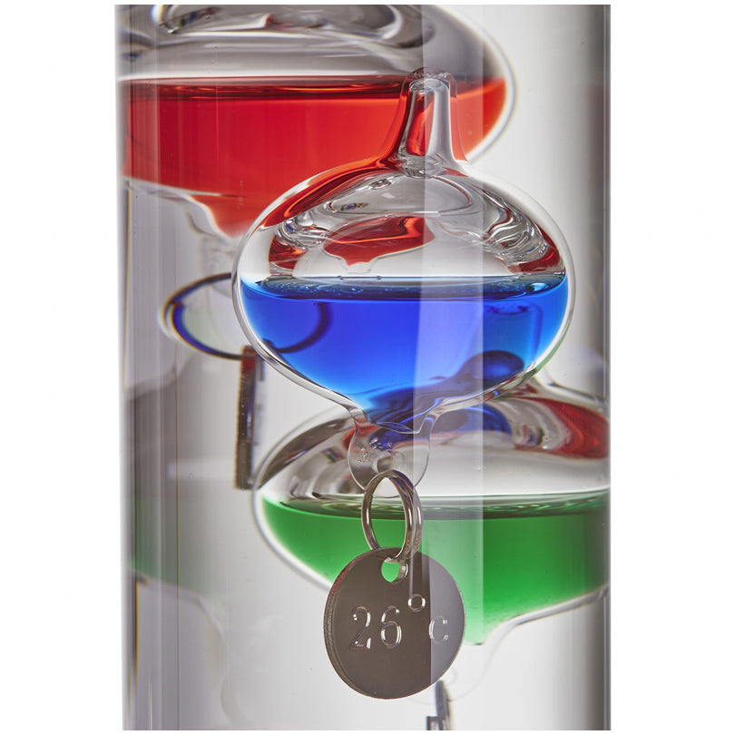 Termometro realizzato secondo l'idea di Galileo Galilei (1564-1642). Galileo scoprì che i liquidi cambiano la loro densità a seconda della temperatura. Se la temperatura aumenta, la densità del liquido nel termometro diminuisce. Le sfere, relativamente più pesanti, perdono galleggiabilità e affondano. D'altra parte, se la temperatura ambiente diminuisce di nuovo, le sfere più leggere acquistano galleggiabilità e salgono gradualmente. La differenza di peso delle 6 sfere di vetro viene misurata con precisione (al centesimo di grammo), in modo che la più bassa delle sfere che galleggia in alto indichi sempre la temperatura attuale nell'intervallo tra 18°C e 26°C.