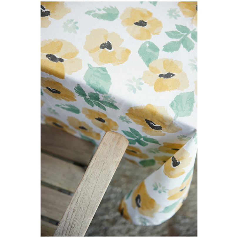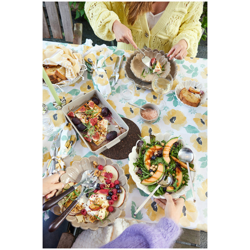 La tovaglia cerata "Eden", realizzata in cotone riciclato (70%) e poliestere (30%), ha un bellissimo motivo. La superficie cerata rende la tovaglia idrorepellente e quindi perfetta da utilizzare sia all'esterno che all'interno. Il motivo è progettato con cura con fiori dipinti in tenui pastelli gialli e beige. Lavaggio delicato in lavatrice a 30°C.