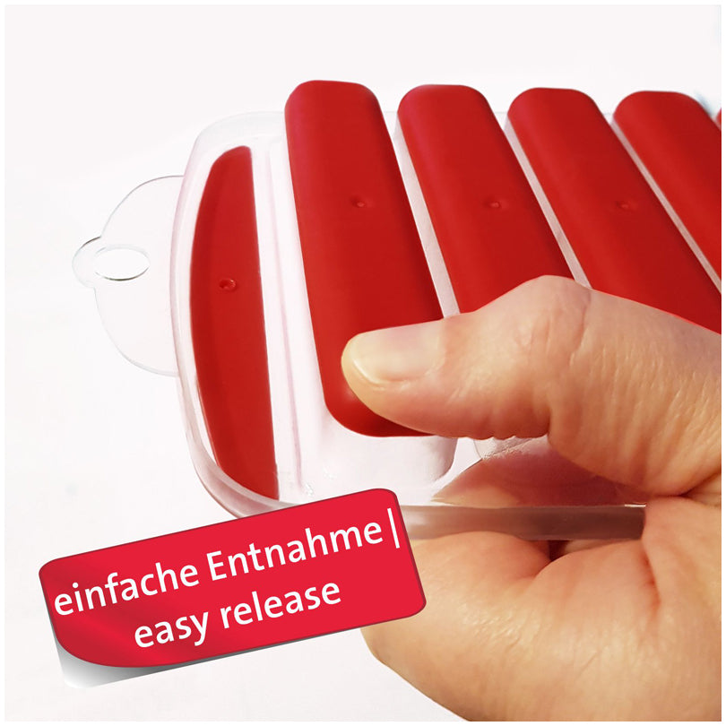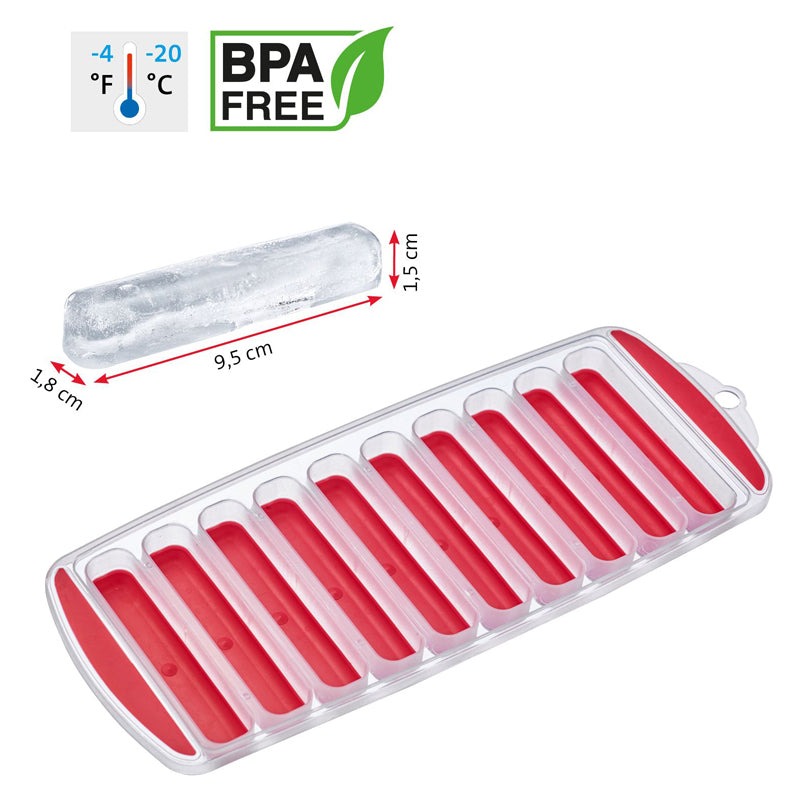 Con la vaschetta formaghiaccio si realizzano facilmente e comodamente 2x10 bastoncini di ghiaccio. Grazie alla vaschetta flessibile, i bastoncini di ghiaccio si lasciono estrarre, anche a porzioni, con facilità. Il coperchio in dotazione, realizzato in polipropilene, impedisce la trasmissione di odori dal vano congelatore. La vaschetta formaghiaccio è adatta anche per congelare erbe aromatiche, brodi e pesto. Impilabile, lavabile in lavastoviglie e priva di BPA.